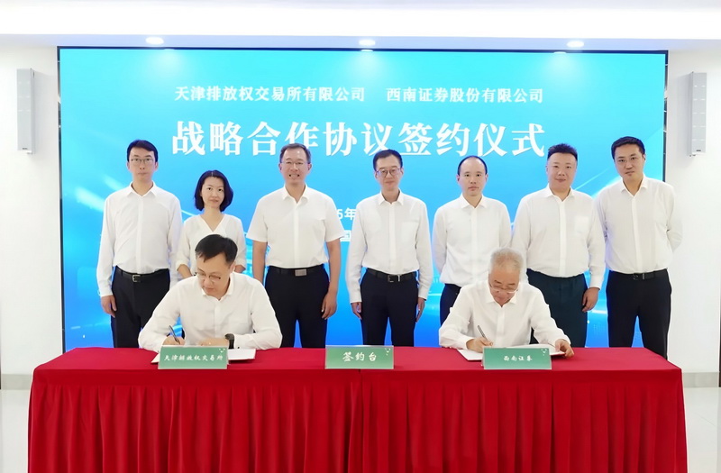 2025年9月11日上午,天津排放权交易所有限公司(以下简称“天排所”)与西南证券股份有限公司(以下简称“西南证券”)在天津市滨海新区签署战略合作协议并举行座谈交流会。天排所董事长夏林,西南证券公司党委副书记、总经理杨雨松共同见证签约。天排所董事、总经理李天,西南证券投资银行事业部执行总裁、固定收益融资二部总经理李军分别代表双方签约。