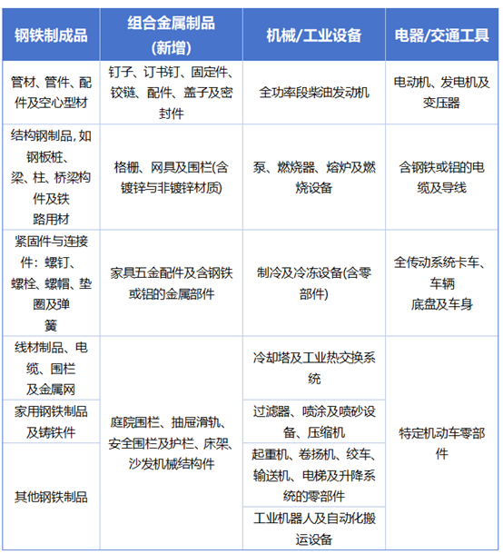 本次扩容主要涉及四大类产品,几乎涵盖从工业设备到日常消费品的所有含钢铝制成品: