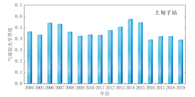 2004~2014年,北京上甸子、浙江临安和黑龙江龙凤山区域大气本底站气溶胶光学厚度(AOD)年平均值波动增加;2015~2019年,均呈明显降低趋势。