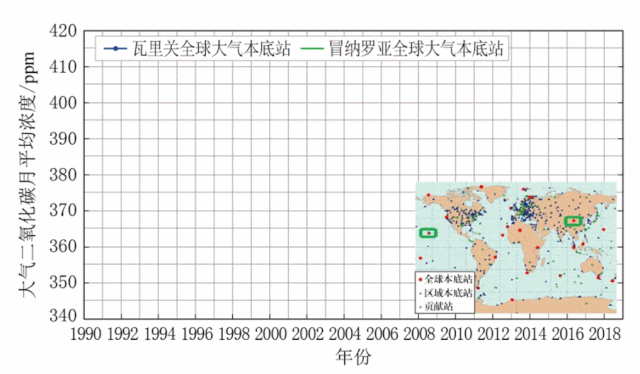 2018年,主要温室气体二氧化碳(CO2)、甲烷(CH4)和氧化亚氮(N2O)的全球平均浓度均创下新高,其中CO2为407.8±0.1ppm、CH4为1869 ± 2 ppb、N2O为331.1±0.1 ppb,分别达到工业化前(1750年之前)水平的147%、259%和123%。1990~2018年,中国青海瓦里关全球大气本底站CO2浓度逐年稳定上升;2018年,瓦里关站CO2、CH4和N2O的年平均浓度分别达到:409.4±0.3ppm、1923±2ppb和331.4±0.1ppb,与北半球中纬度地区平均浓度大体相当,均略高于2018年全球平均值。