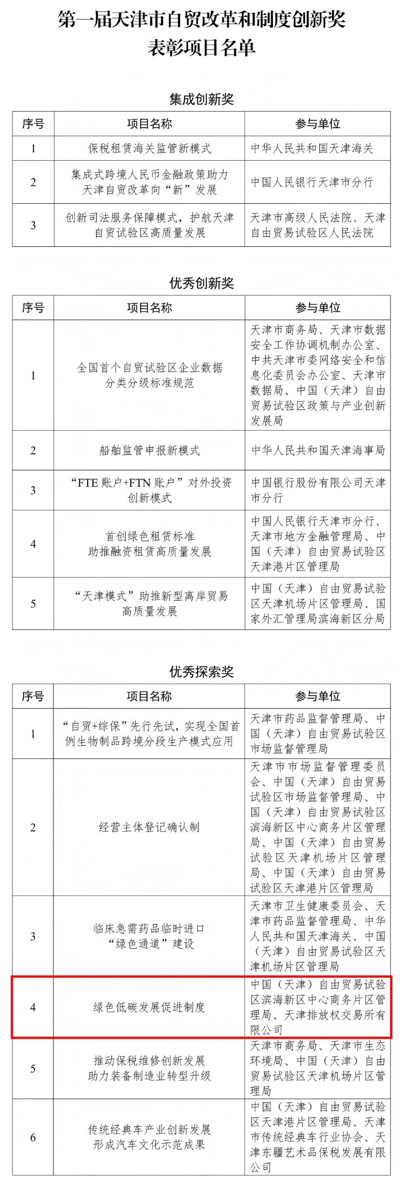 4月21日,天津市人民政府公布了第一届天津市自由贸易试验区改革和制度创新奖获奖名单。由中国(天津)自由贸易试验区滨海新区中心商务片区管理局联合天津排放权交易所共同申报的“绿色低碳发展促进制度”项目,荣获“优秀探索奖”。